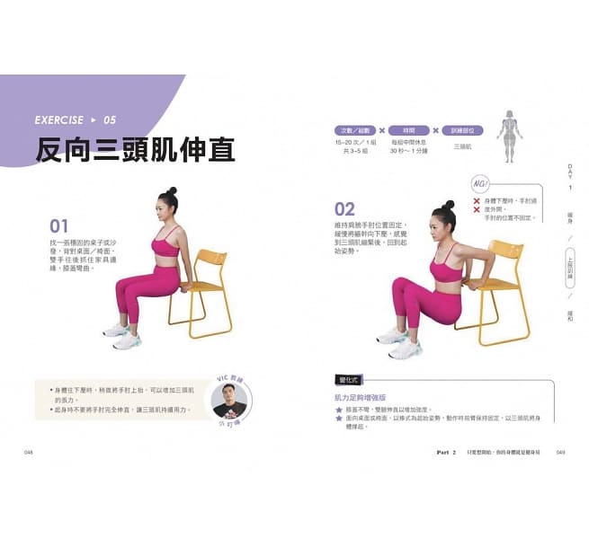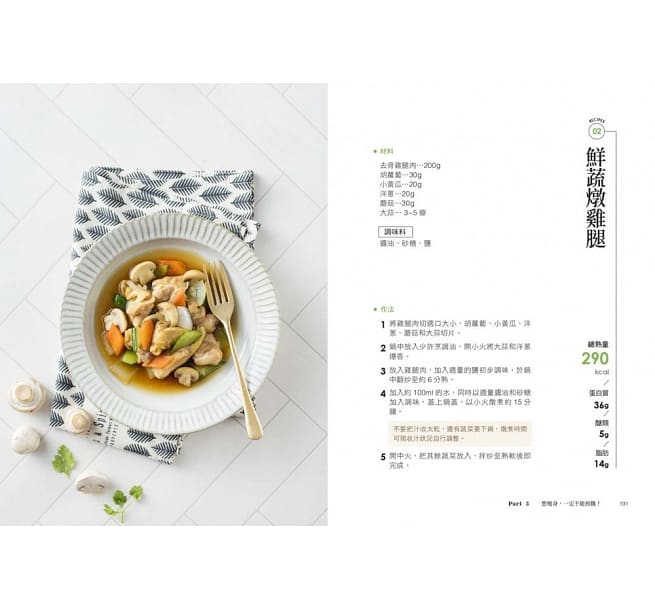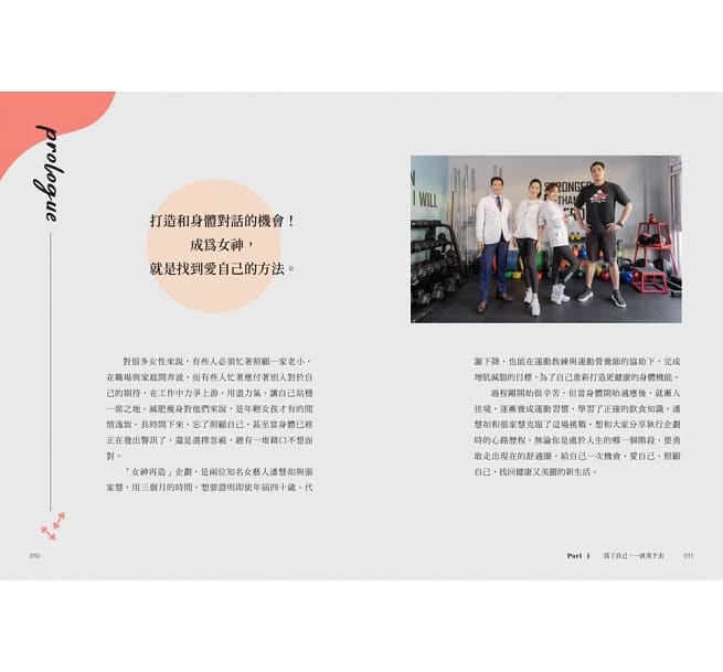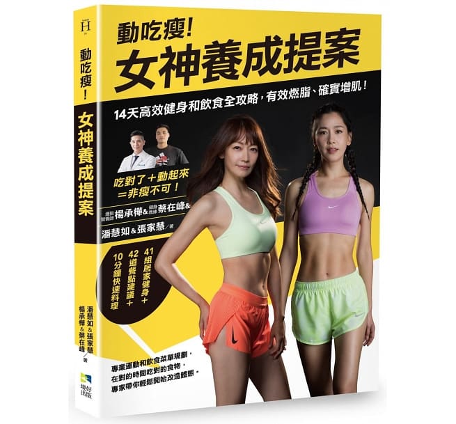 這本《動吃瘦!女神養成提案》由運動營養師、運動教練以及潘慧如和張家慧共同參與,收錄41組居家健身訓練、42道增肌減脂食譜以及懶人、忙碌OL必備的「10分鐘快速料理」,同時還搭配現正流行的「運動+168斷食」的重點建議、一日三餐運動飲食原則等等,完全是超詳細的增肌減脂養成懶人包。