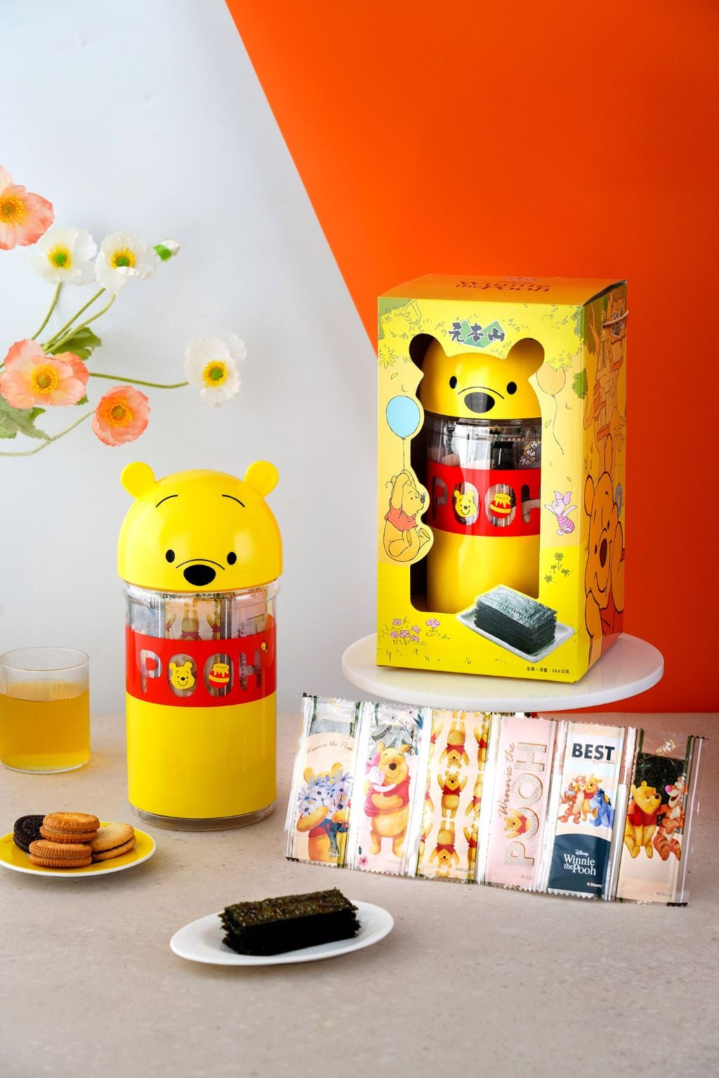 過年聚會最怕空氣突然安靜,這時候拿出一盒超吸睛的禮盒,絕對是最佳破冰神器!元本山身為「肖像專家」,今年的聯名款真的讓人尖叫。第一眼看到這款「小熊維尼造型罐」心就融化了,黃澄澄的維尼大臉超級療癒,而且裡面每一片海苔都有獨立插畫包裝,共有6款不同設計,吃海苔就像在拆禮物一樣充滿驚喜。