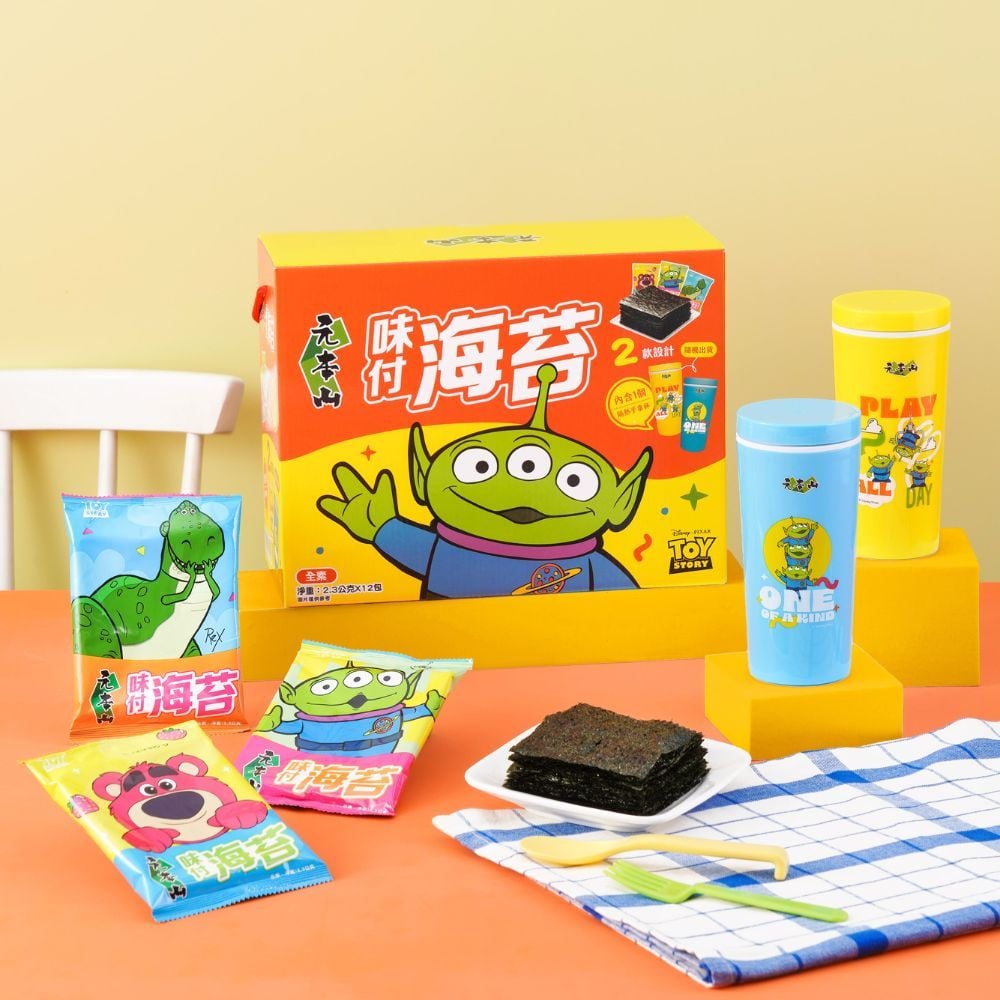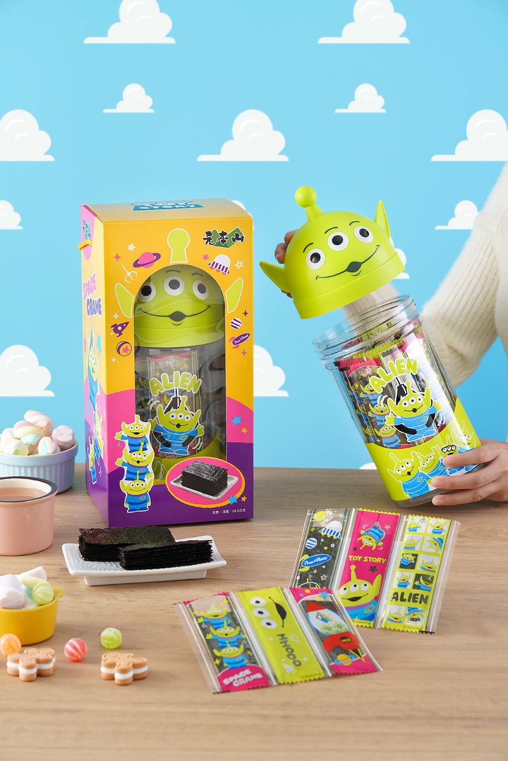 除了維尼,粉絲敲碗已久的「三眼怪」也化身立體造型罐強勢登場!那個標誌性的綠色外星人頭像做成蓋子,打開來拿海苔的瞬間真的太可愛。重點是,這些海苔吃完後,罐子千萬不要丟,直接變身書桌上的收納小物,不管是放文具還是飾品都超實用,讓妳的心意可以一直陪伴在朋友身邊。