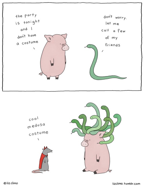 筆觸相當溫暖的插畫家Liz Climo其實本身是辛普森卡通動畫的製作成員,負責的是角色塑造和故事修正的部分。閒暇時的她喜歡畫漫畫,過去曾多次發表漫畫作品,這次以「動物們的萬聖節」為視角進行創作,幽默的敘事風格讓人看了實在忍不住嘴角抽動啊~(妞編輯頻頻被逗樂)