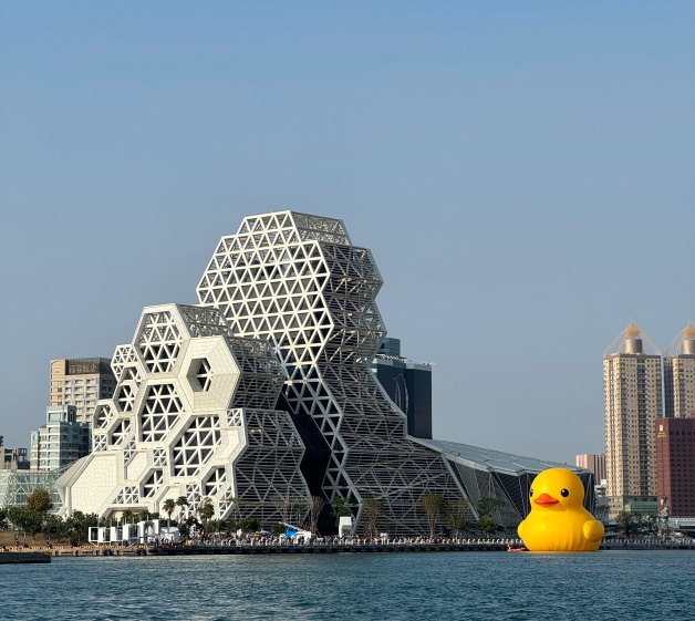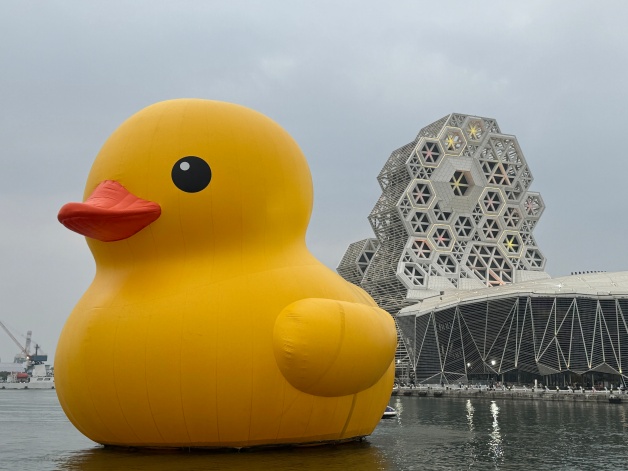 黃色小鴨由荷蘭藝術家「弗洛倫泰因·霍夫曼」所創作,2013年登錄高雄光榮碼頭、桃園新屋鄉後湖埤、基隆海洋廣場,今年以「雙鴨進港」重磅回歸重返高雄愛河灣,分別位在音浪塔和珊瑚礁群旁水域各展示一隻黃色小鴨,可愛的模樣讓老少年Super Juinor的銀赫來台舉辦FAN PARTY時也抽空踩點呢!