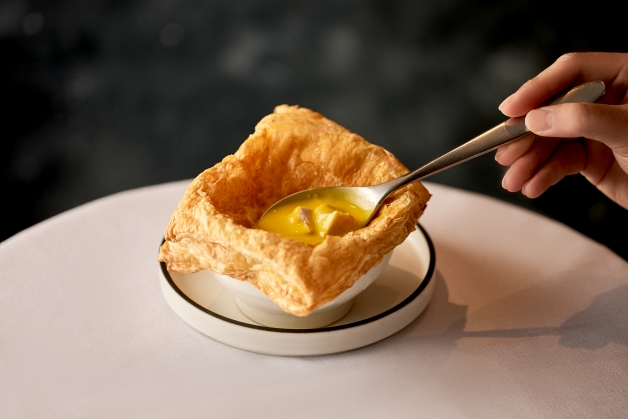 「起司南瓜酥皮濃湯」敲開金黃酥香的酥皮,並拌入熱燙濃郁的南瓜湯,每一口都療癒又飽足!