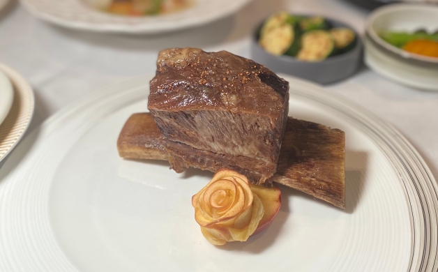 「王品牛小排」由20多種蔬菜及香料成就獨家醬汁,再以250℃高溫烘烤,緊鎖肉汁,搭配蒜片、蜜蘋果花、沾附Gravy醬汁,再嚐回烤後的酥香帶勁,經典滋味不可錯過!