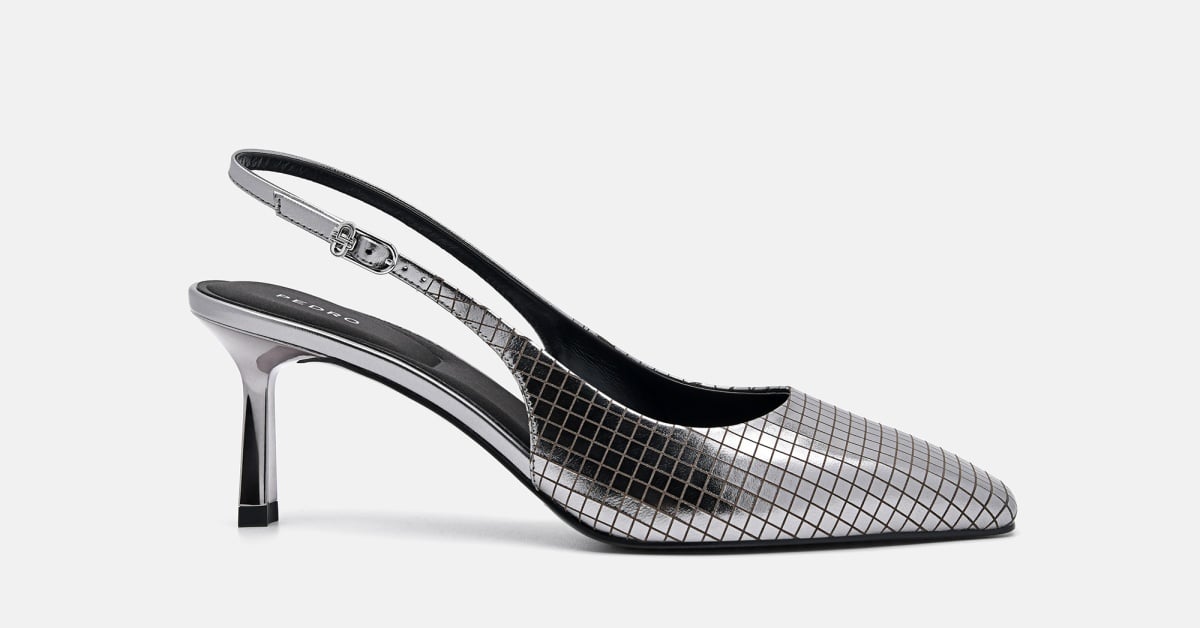 融合精緻工藝與未來感,這雙後帶高跟鞋以小羊皮打造,鞋面加入雷射切割金屬格紋、俐落方頭設計——帥、優雅、派對感一次解鎖。白天通勤 OR 晚上赴約都完全 OK。