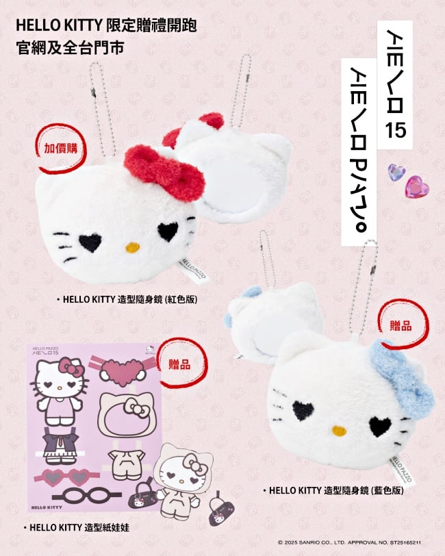 購買任1件HELLO KITTY聯名款商品,單筆加NT.399換購HELLO KITTY造型紅色版隨身鏡、在官網限購買聯名款商品,單筆滿NT.2,500就能免費擁有HELLO KITTY造型隨身鏡藍色款,信義店則是購買任2件聯名款商品送HELLO KITTY造型紙娃娃,另外,於11月24日至12月14日期間於信義店消費,在IG、Threads打卡裝置就現折50元喔~