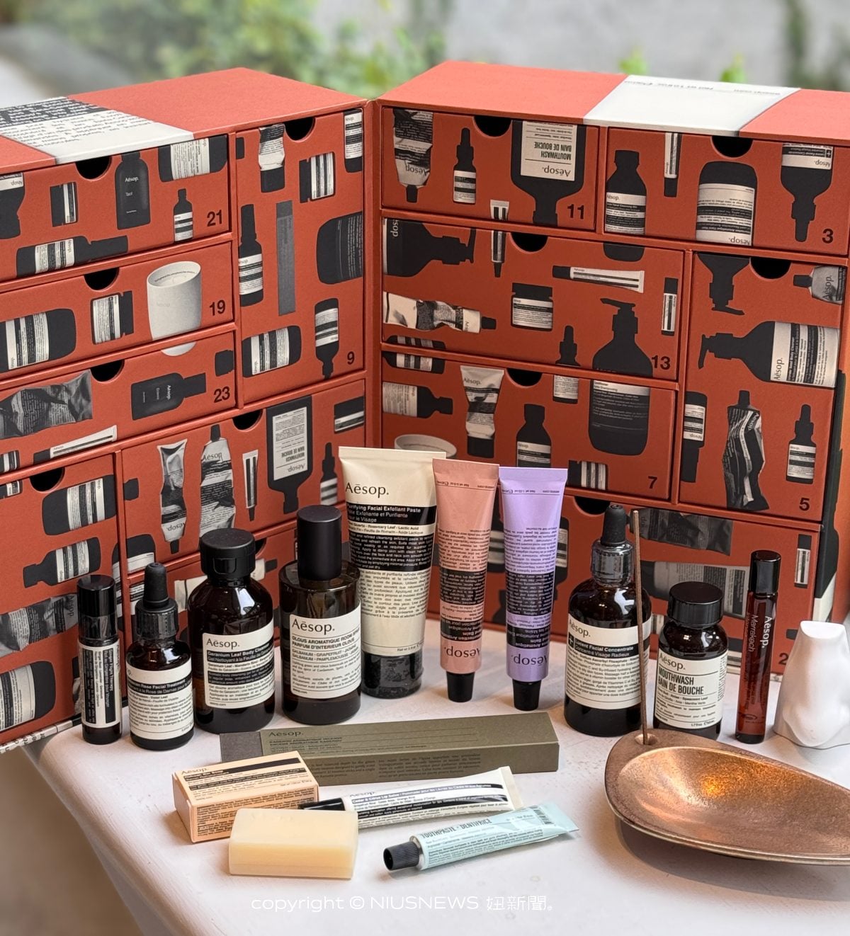 倒數月曆集結了Aesop經典熱賣的香氛品項,從身體潔膚露、護唇膏、去角質霜、芳香室內噴霧、香氛擺件等都有,還可以入手蜻蛉線香、青銅線香座、香氛擺件,整組真的好澎湃。