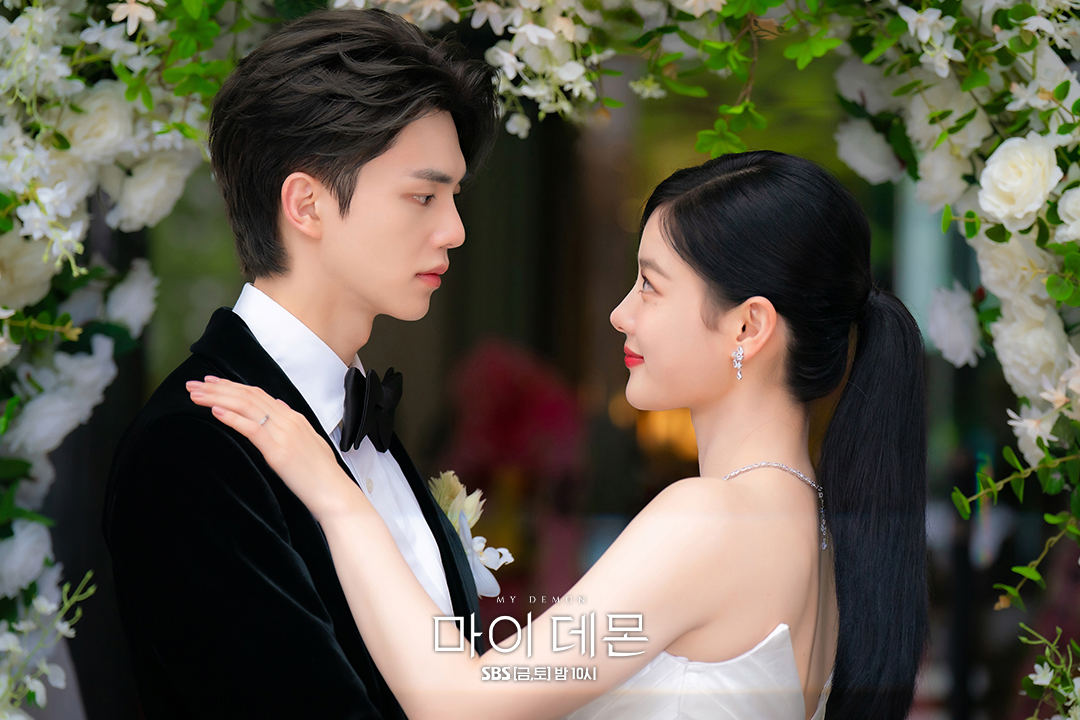 《與惡魔有約》由金裕貞、宋江、李相二、金海淑、趙慧珠領銜主演,劇情講述未來集團繼承人都到曦(金裕貞 飾)性格高傲、不相信愛情,直到遇見了依靠與人類交易而獲永生的惡魔鄭九元(宋江 飾)才慢慢改變。兩人同樣在首幾集就馬上步入婚禮,金裕貞的婚紗造型為緞面白紗,雖然髮型簡單且沒有頭紗,但還是擋不住女神本身的高顏值,白紗一出場根本美翻天!