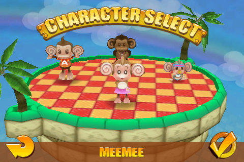 進入Super Monkey Ball 2的遊戲主畫面之後可以看到十分可愛的選單,除了主遊戲之外,也可以回顧之前過關的紀錄影片、額外的小遊戲等選單,在[Main Game]的主遊戲選單下, 玩家可選擇喜歡的猴子角色。