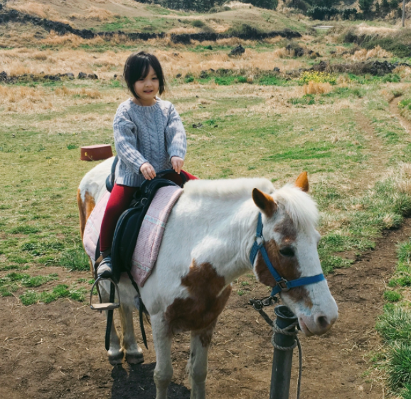 在恩去到濟州島玩時還騎了馬,通常小朋友都會很怕馬,在恩卻老神在在還很享受其中,是一位大膽的小公主呢~