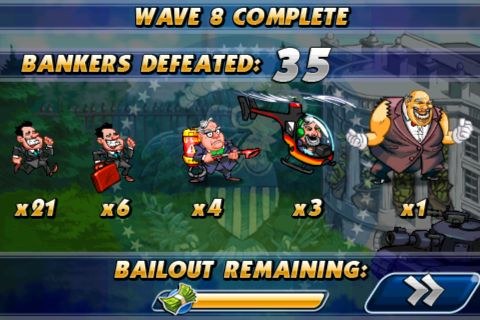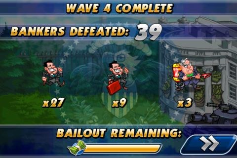 Bailout Wars每一個關卡都時間都很短,只要玩家將這一階段所有需要消滅的Banker都擊敗就會進入下一關。而隨著玩家通過的關卡越來越多,同時出現的Banker也會越來越多,玩起來會非常忙碌,氣氛十分緊張刺激!