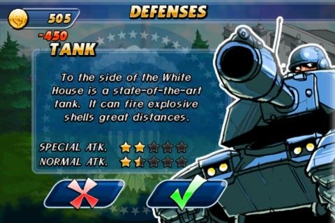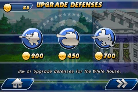 玩家可以購買到的火力協助有三種,包含了坦克車、山姆大叔(Uncle Sam)及狙擊手。每次玩家完成一關,要進入下一關之前都可以升級以上三者的攻擊威力!當然,在你購買之後,他們就會出現在國會山莊的屋頂或旁邊來保衛國庫了!