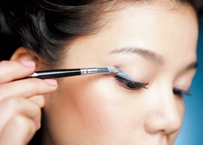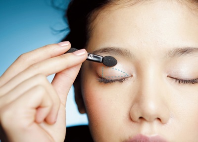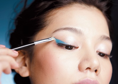 眼線刷沾藍色眼影霜由眼中央往後畫出一個小三角型,定出範圍也為後續眼影打底。