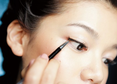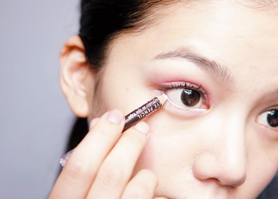 白色眼線筆沿下眼睫毛根部描繪,不超過眼頭與眼尾。