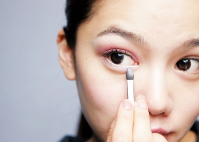 海綿棒沾粉紅色眼影,由睫毛根部開始向上暈染,記得越上方動作越輕。
