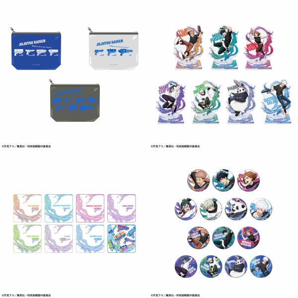 H賞為透明隨身包,分為有黑、白、藍3個顏色,不只有《咒術迴戰》的英文名稱,更有3把水槍的圖樣,加上「Which one do you choose?」字樣也相當可愛;I賞為壓克力角色立牌;J賞為印有角色名字和他們所使用的水槍圖樣的手帕;K賞為個人款的別針徽章。