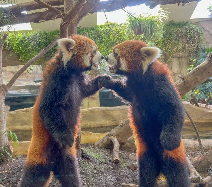 小熊貓(Red panda)也叫「紅熊貓、紅貓熊或九節狼」,是一種比家貓略大的小型哺乳動物,原產於中國西南地區,有著胖嘟嘟身軀、紅褐色毛袍與蓬鬆大尾巴,由於前肢較短的緣故,所以走起路來搖擺蹣跚,十分呆萌可愛!在野外生活的小熊貓本應是獨居動物,但因為住在動物園裡再加上一起長大,大福&大事堪稱是如影隨形,完全不計較在領地內出現對方的氣味,軟乎乎的萌樣真的讓人好想抱緊處理~
