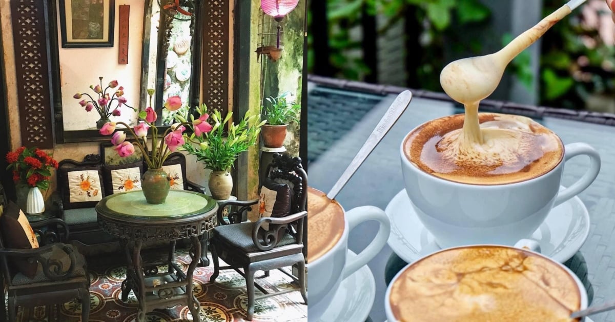 「Cafe Phố Cổ」用當地老宅改造而成,外觀茂林深篁激似武林高僧修行廟宇(XD)但往裡面一走,深木頭色調、刺繡抱枕、雕花桌椅等傢俱,都讓妞編輯有種回到阿嬤家的錯覺,古樸風情悠久而親切,如魚鱗般整齊排列的懷舊綠瓦屋成為它的標誌。顧客來訪都是為了品嚐「雞蛋咖啡」,厚厚的綿密奶泡挾帶著苦甜香氣,三口秒KO的好滋味大家一定要來試試!