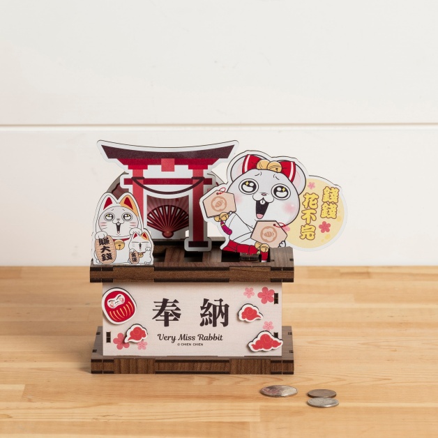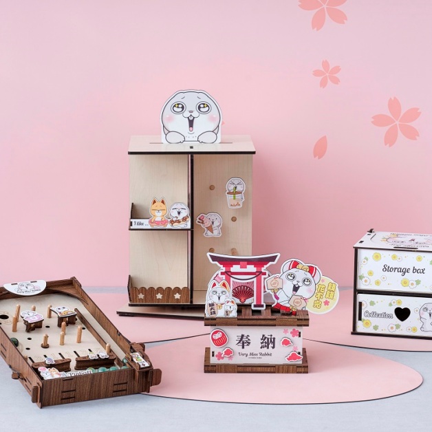 例如「錢途無量奉納箱」具存錢筒功能,外型結合鳥居、招財貓與不倒翁,營造濃濃日本風情,搭配擁有水汪大眼、手持祈福繪馬的「好想兔」,為你祈求財運滾滾來;「旋轉飾品小物收納架」不僅能360度旋轉使用與展示,另有掛勾可懸掛鑰匙或口罩等,適合置於家中客廳玄關入口,外觀吸睛又實用;「遊樂園兩用彈珠台」展現「好想兔」與夥伴們玩耍追逐的生動情境,無論是歡樂親子對戰時光或當空間擺飾都超搭!