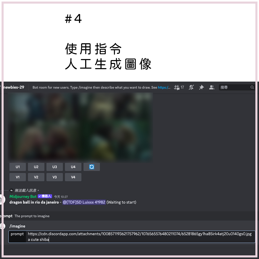 不過,因為我們想使用參考圖像功能,所以需要在框框內先貼上圖片網址,空一格後再接著輸入描述文本(如圖所示),全都輸入好之後按 enter 送出,AI 就會開始繪圖啦!第一次使用指令時,系統可能會跳出驗證,妞妞們點擊接受後就能正常使用囉。