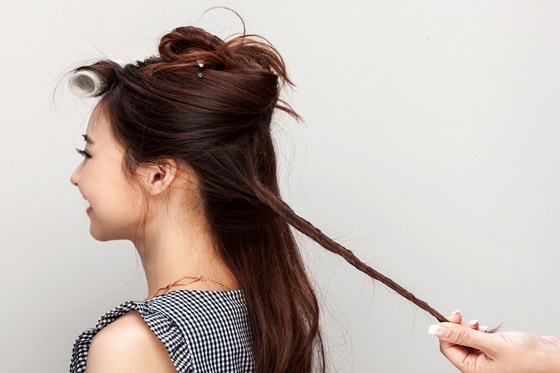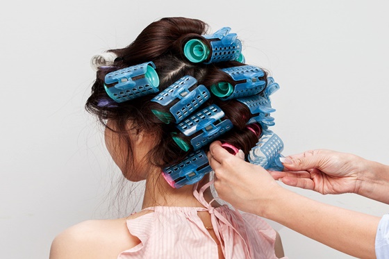 #髮絲上捲前,先用海綿捲將瀏海固定,最後再放下,瀏海才能保有不扁塌空氣感。