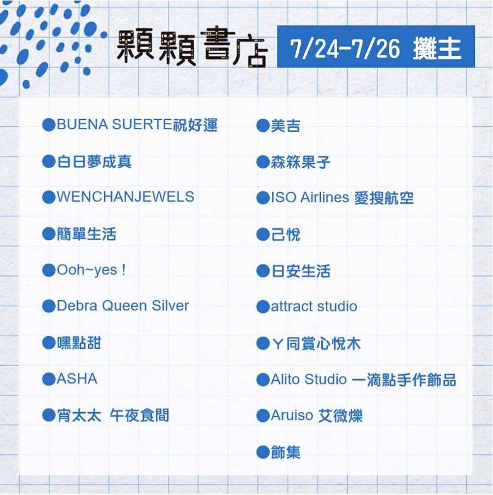 最後就附上本週末(7/24~7/26)參加的攤位給各位參考,顆顆書店表示也歡迎有興趣的人報名攤主,與大家一起共襄盛舉。由於每週末攤位與出演的街頭藝人不盡相同,建議妞妞們留意顆顆書店的粉專消息(點我前往),以便查看最新消息、當週進駐的文創品牌與街頭藝人。