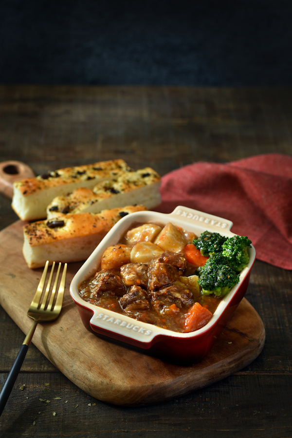 在星巴克設計的獨特料理舒心帕里尼」中夾入牛肉與起司與油漬蔬菜、並裹上主廚獨門的風味醬汁,口感豐富讓人一吃就上癮!另外還有一款「主廚版紅酒燉牛肉」,則是精選了上等牛肋塊,用秘製手法處理再以紅酒燉製、加入多樣蔬菜燉煮搭配上佛卡夏食用更是超有層次感,是道費工必食的好菜。