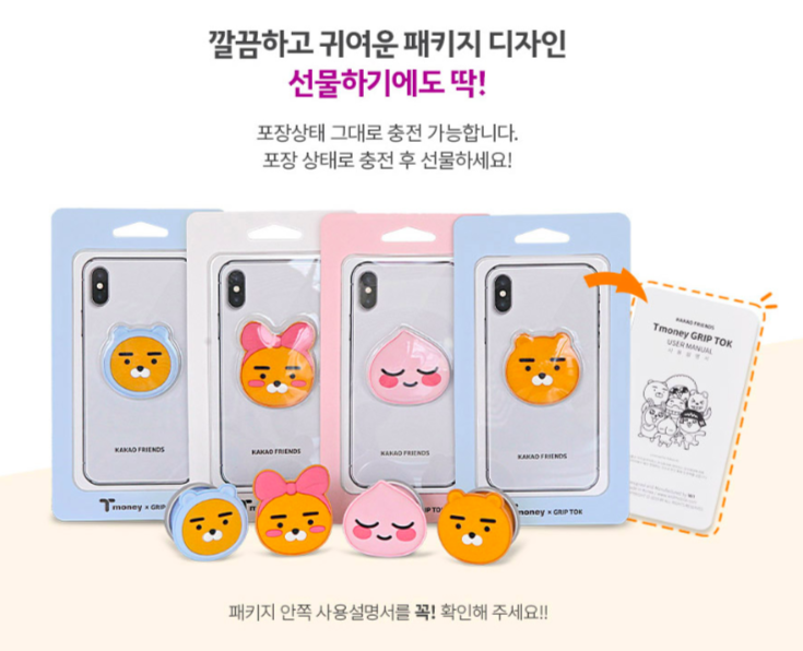 這款交通卡手機架共有四款,分別為帽T萊恩、蝴蝶結萊恩、一般萊恩與桃子,在Gmarket上可以找到這款商品的蹤跡,在此提供網址(點我)給大家參考。如果最近剛好會到韓國旅遊的妞妞,也可以看一下手機配件店或KAKAO STORE有沒有販賣這款商品囉。(要注意看背面是否寫Tmoney字樣,才是能嗶進地鐵的手機架哦)