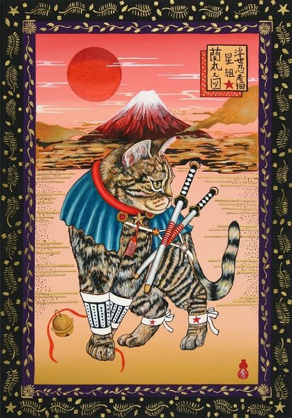 除了浮世繪的風格之外,田中秀治還加入了忍者的元素,讓貓咪們繫上腰帶與佩劍,看起來威風凜凜,彷彿真的要出門遠征的樣子~(其實是要出門遠足)