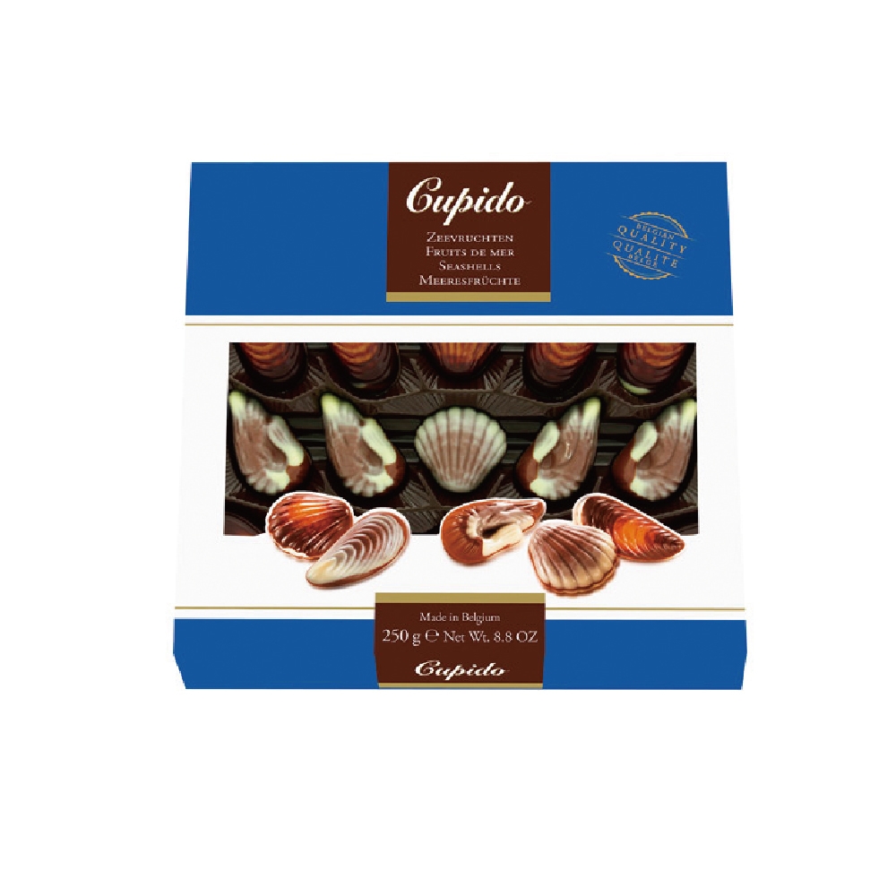 新光三越超市所販售的「cupido貝殼巧克力」,出產於以高品質巧克力聞名的比利時,能讓情人的舌尖彷彿漫遊於異國之中。