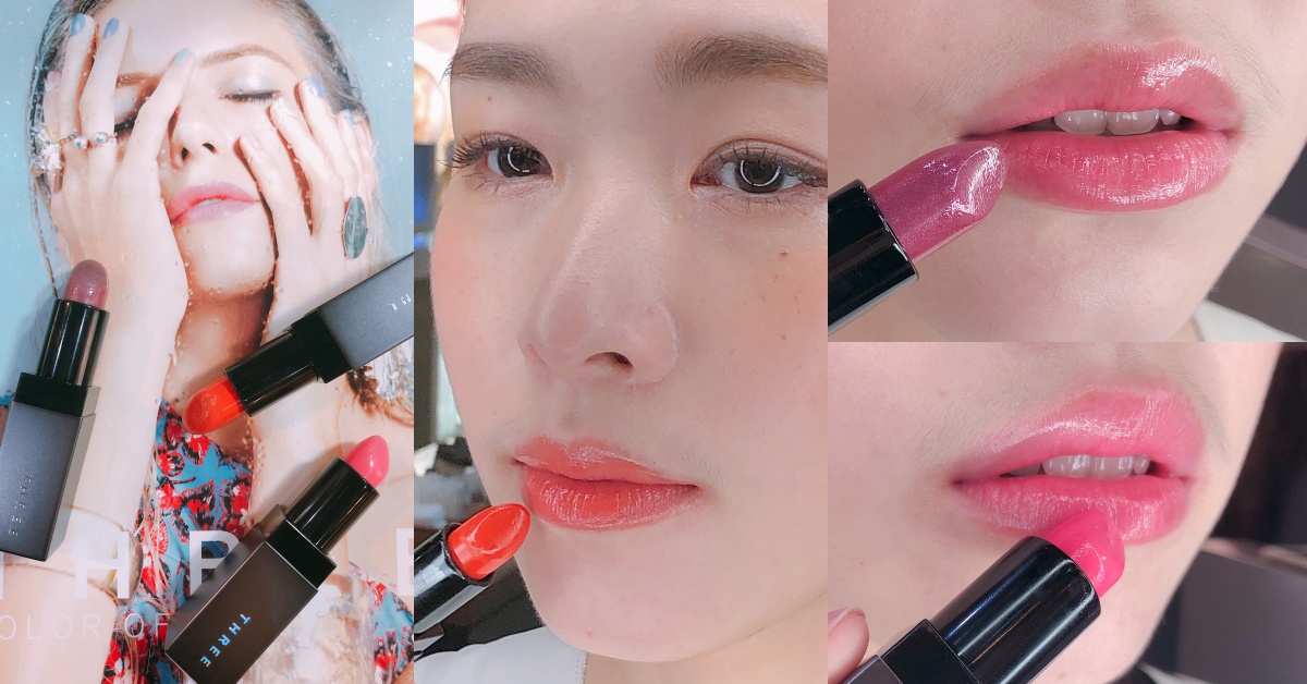 2019 THREE夏限定彩粧系列的核心概念為「COLOR OF RAIN雨色氛圍.洗滌心塵,蛻變重生。」,描繪夏雨後放晴的天空,大大的彩虹,耀眼的光暈色彩,無論是唇彩、指彩都是輕盈耐看的洗鍊新色。三色唇膏能賦予雙唇潤澤保濕,如同水面上折射出的光輝,映出雨後彩虹的色澤,保有透明感的同時高度顯色。