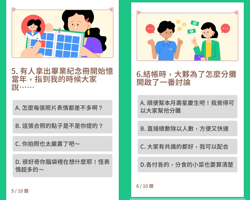 測驗中提到的問題應該都是大家日常生活中會碰到的事情,所以很多問題妞編輯在作答時都好糾結(笑),畢竟同學會的氛圍實在很兩極,有可能大家各玩各的,也有可能大家都玩在一起。就看妞妞們的個性是比較害羞,或是以前在班上就是大家的開心果,主揪也當習慣了?