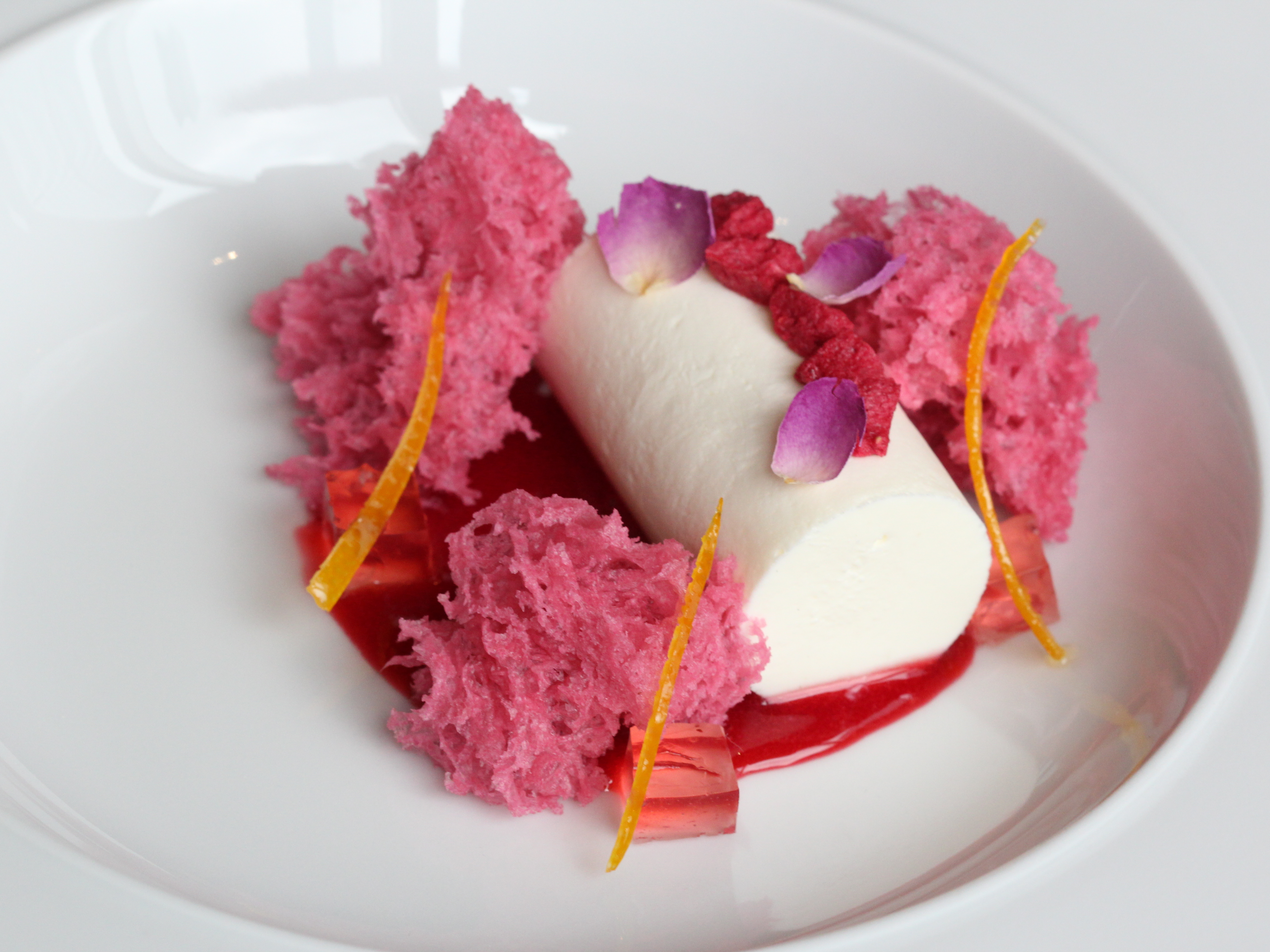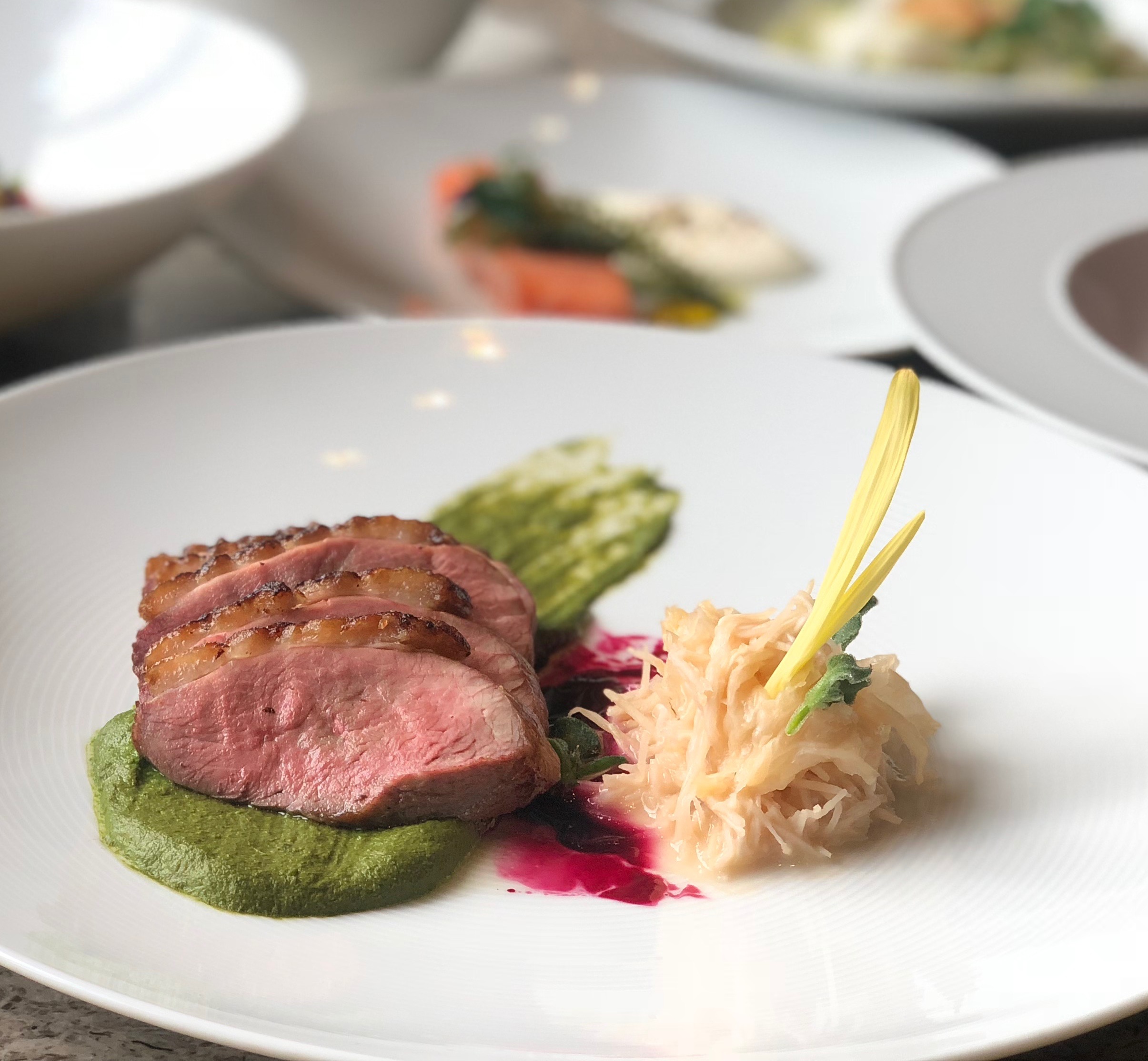 這次的母親節菜單充滿了春天的氣息,以綠色為主調,用花瓣點綴其中,打造一道道浪漫精緻的料理。主餐的食材採用宜蘭嚴選的櫻桃鴨,以蒜香白酒炒台灣芥蘭製成口感綿密的蔬菜泥,搭配山藥的滑嫩與白木耳的酸脆,佐以甜菜根汁與鴨油調製而成的油醋醬,帶來視覺與味覺的雙重饗宴。整組套餐裡面妞編輯最喜歡的就是甜點啦!將食品級玫瑰花與覆盆子以極細緻的工法呈現,搭配清爽的乳酪慕斯,給予味蕾全新的刺激,視覺上也同樣吸睛,令人念念不忘吶!
