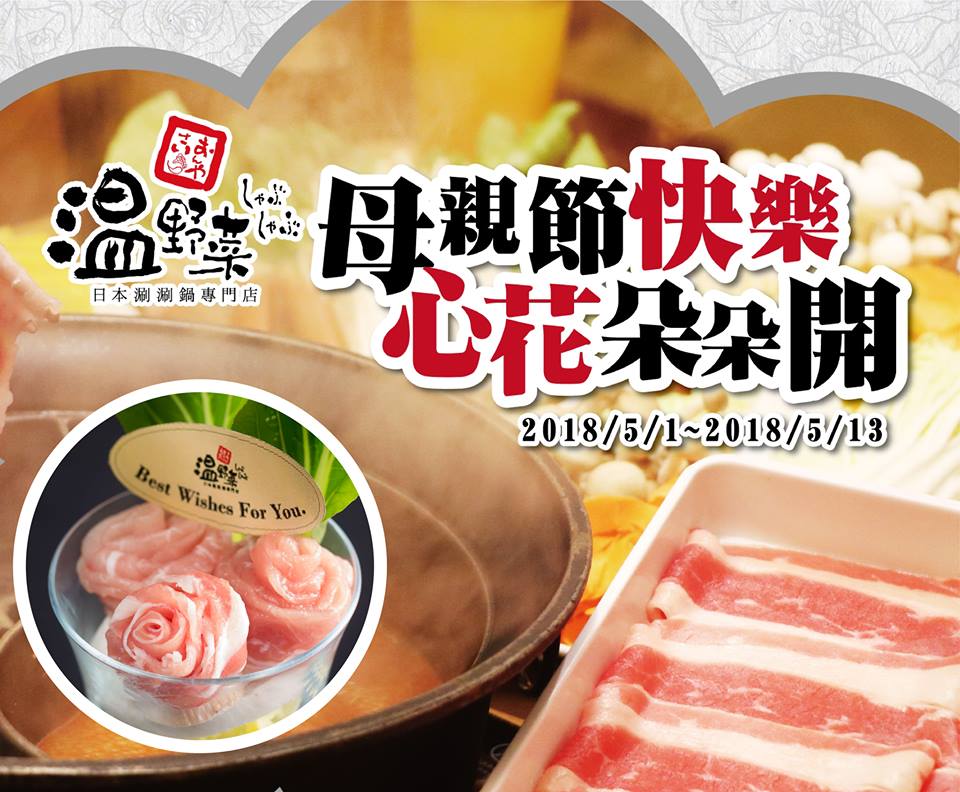 期間:5月1日至5月13日消費滿一千元即贈百元券乙張,5月11日至5月13於前一天訂位,再加碼贈送「温野菜肉肉花朵」