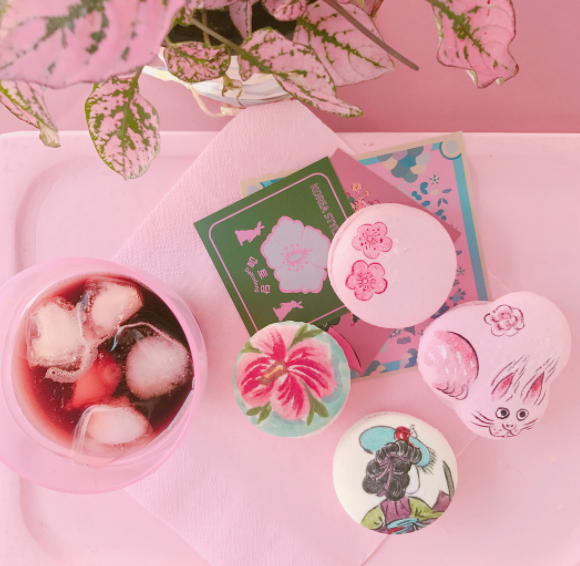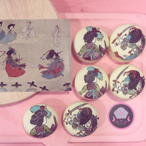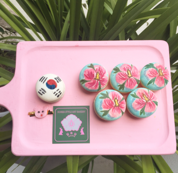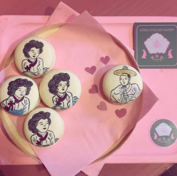 甜點師daltodang的馬卡龍應該很能引起韓國人的共鳴,因為每一個馬卡龍上都畫著韓國的特色,例如畫了韓國太極旗和韓國國花木槿花的馬卡龍。
