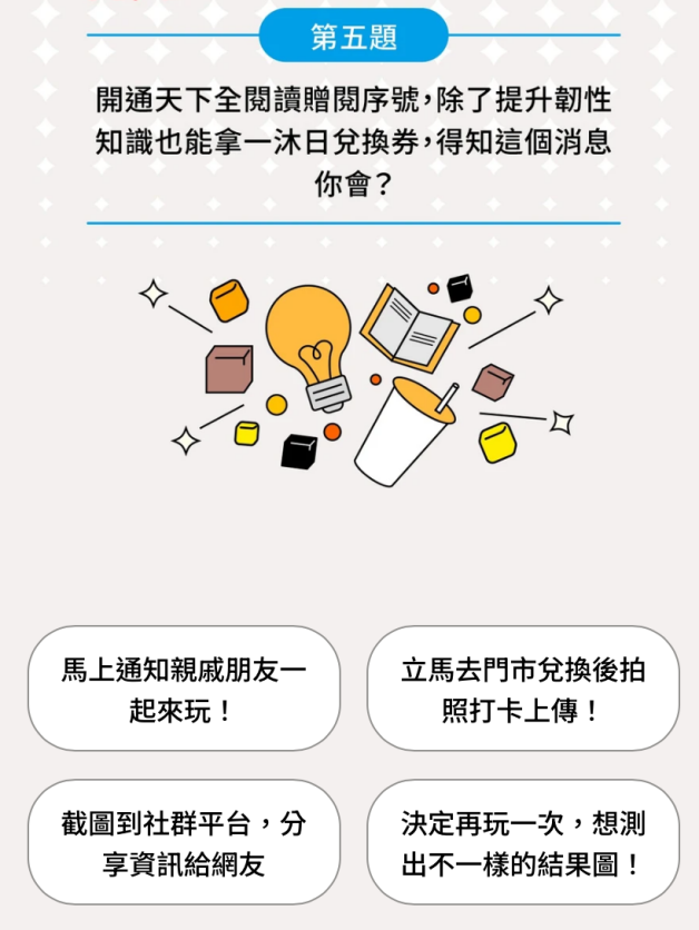 最後一題!玩遊戲拿到飲料兌換卷,妞妞們會馬上通知朋友、馬上拍照打卡、分享資訊給網友,或者再玩一次想測出不同結果?