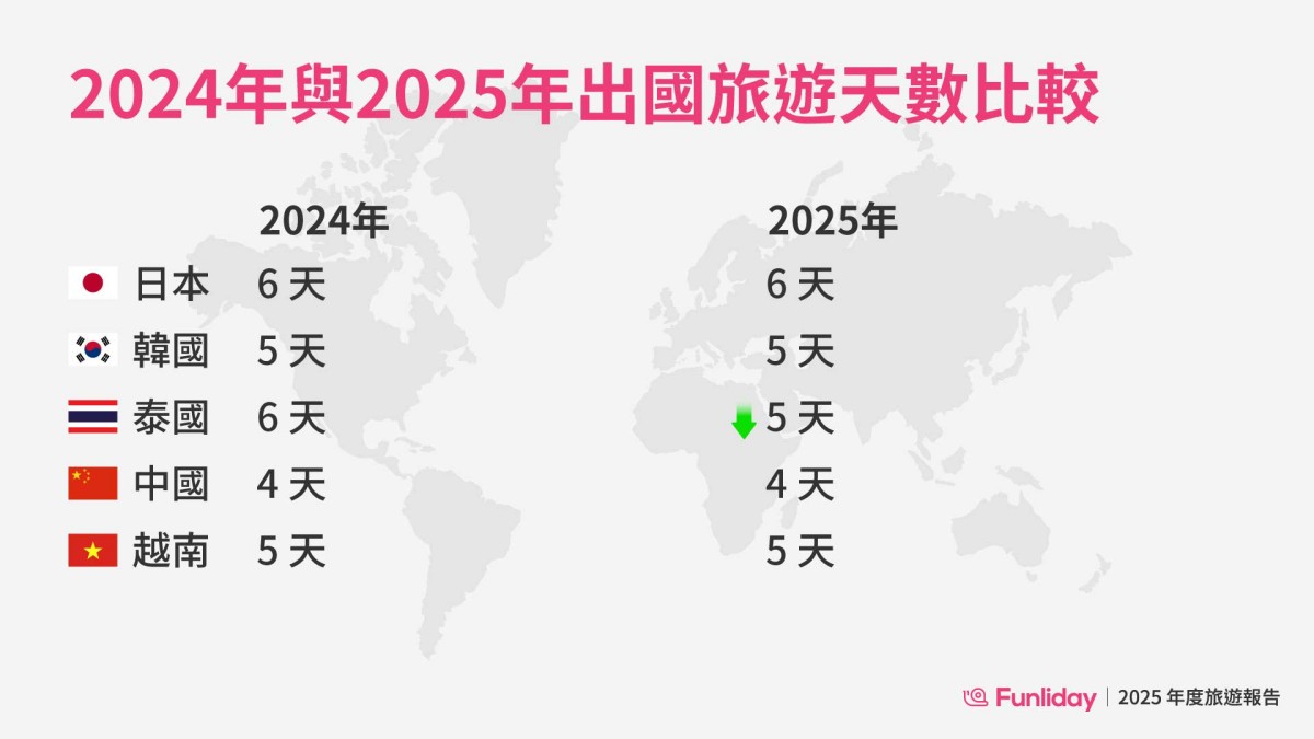 (圖說:2024 年與 2025 年出國旅遊天數比較,泰國微縮至 5 天)