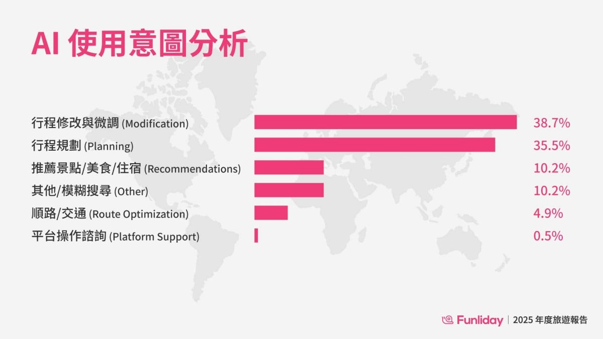 不論是 J 型人或 P 型人都愛用的「行程修改與調整」的需求佔比高達 38.7%,首度超越了單純的「行程規劃」(35.5%)。這意味著台灣旅客很有主見,不再滿足於 AI 給的標準答案,而是頻繁對這位「神隊友」下指令:「把第二天改成去迪士尼」、「幫我加一個拉麵店」。這種互動證明了 AI 不只是工具,更是能聽懂人話、隨時配合改變計畫的貼心旅伴。
