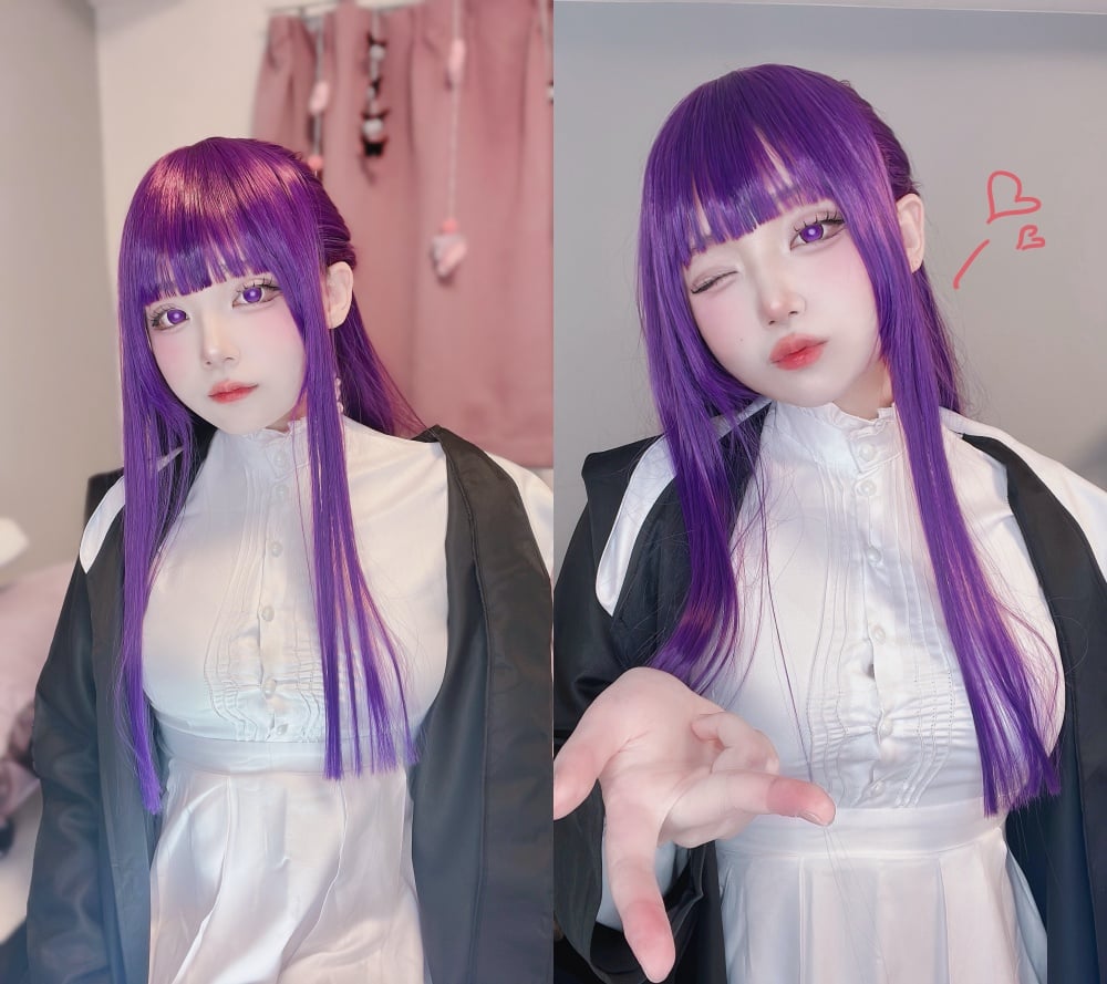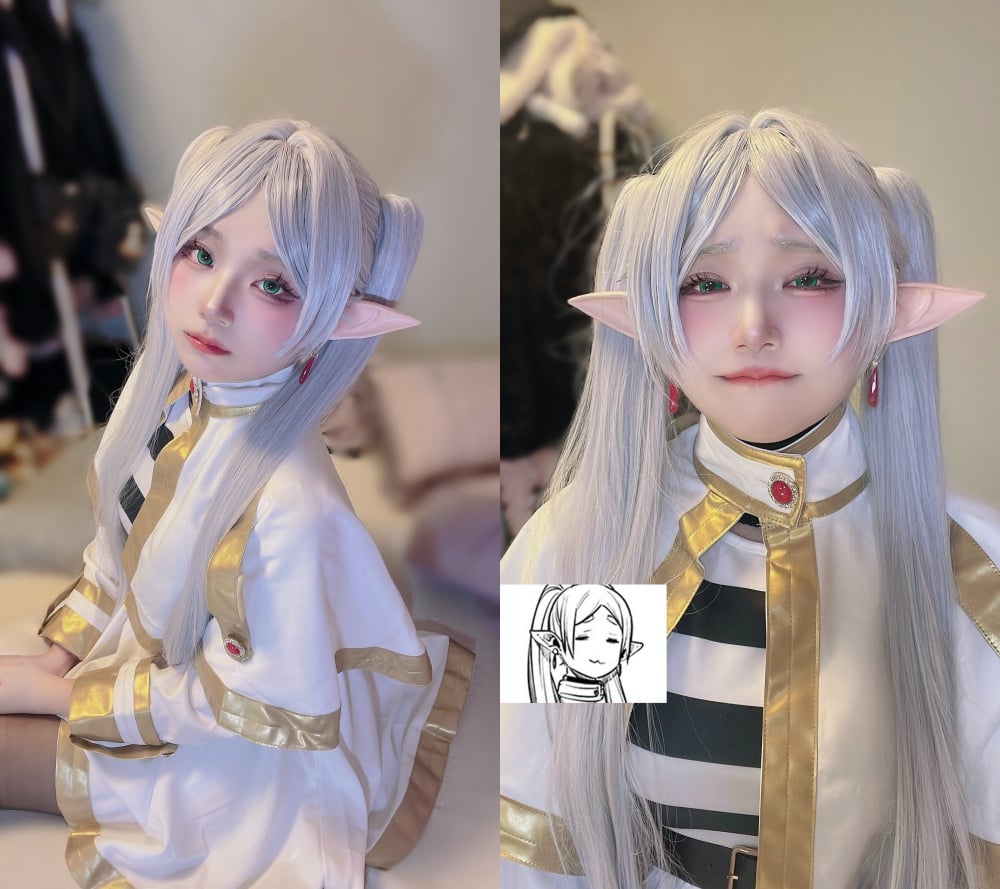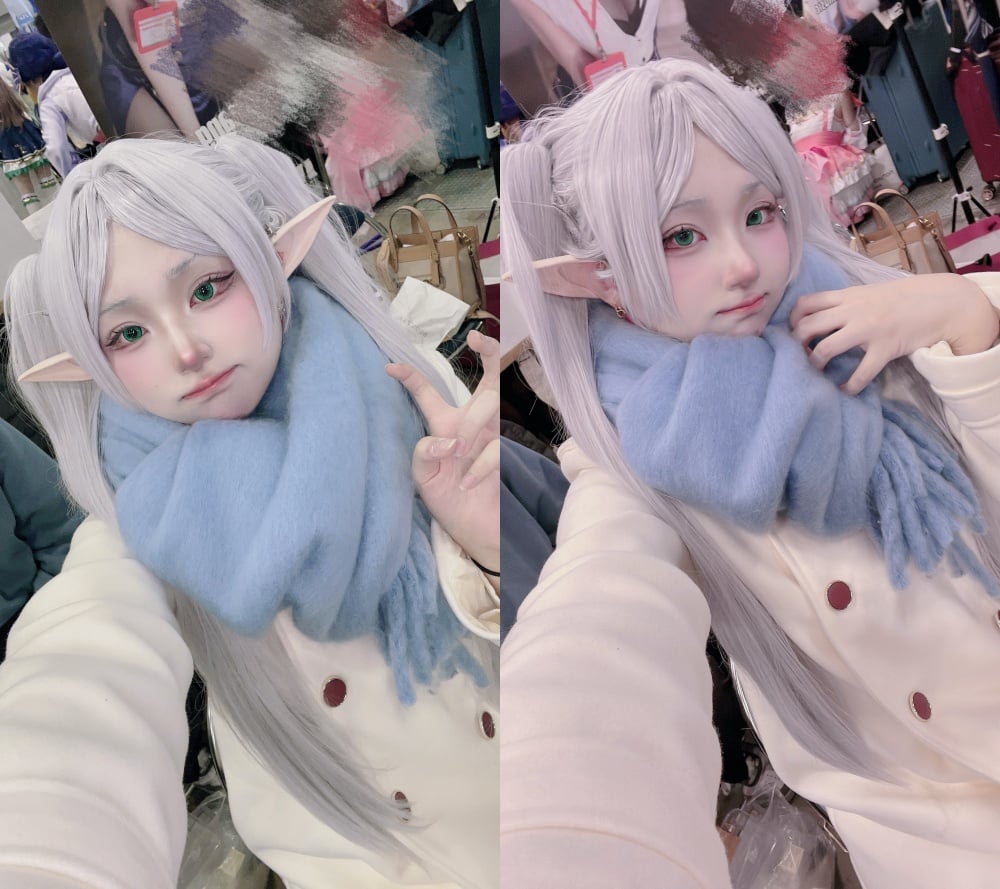 早在扮演成費倫之前,プリンちゃん也曾以芙莉蓮之姿現身。無論是穿著夏衣或冬裝的芙莉蓮,都靠著她驚人的Cos能力將其標誌性的造型還原,同時她也模仿了芙莉蓮做出無奈的顏藝,不得不說圍著圍巾的模樣,真的好萌(><)。