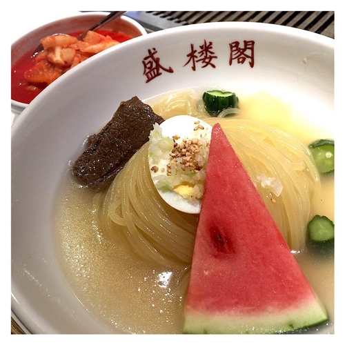 除了ぴょんぴょん舍之外,附近還有這家盛樓閣的「西瓜冷麵」也很有名,兩者並列當地的名店,只要找得到ぴょんぴょん舍,就一定也會看到盛樓閣,簡單說就是一個打對台的概念,不過盛樓閣比較特別的是,還有泡菜醬汁的辣味可以選擇喔!