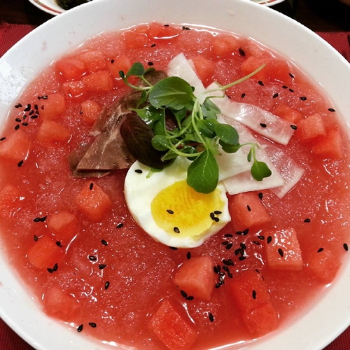 而他們最有名的就是這道「西瓜冷麵」,鹹鹹的醬油配上甜甜的西瓜,應該很難想像其交錯融合的味道吧?不過根據吃過的人都表示,西瓜的清甜讓整碗冷麵變得更清爽,恰到好處!(光用看的就很消暑啊!)
