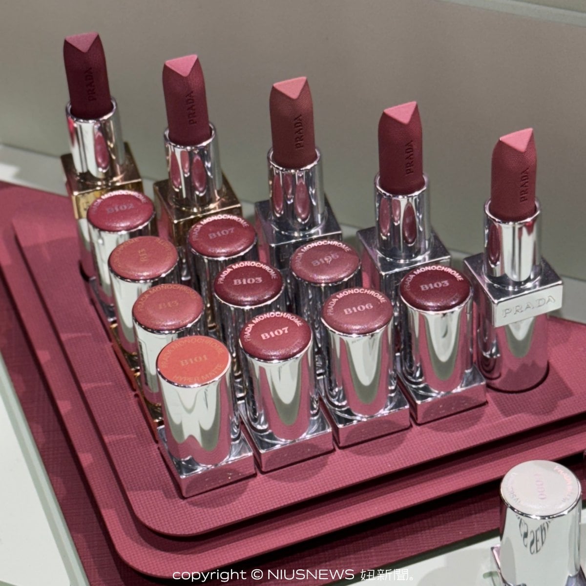 在快閃店的第二站,特別安排了彩妝保養體驗區,從底妝、眼影到唇彩通通有,全球最熱賣的「革紋極霧唇膏」和「尼龍柔霧唇膏」兩大系列共35色唇膏首度亮相,JUNGWON推薦的B03#醜赤棕、SUNOO推的B101#廢裸棕這裡通通買得到。還有全球熱銷人氣王PRADA GREEN經典潤唇膏,這次在快閃店非常難得有現貨,妞編輯私推來快閃店真的要帶一支,男女都可以用,JUNGWON同款必須擁有。