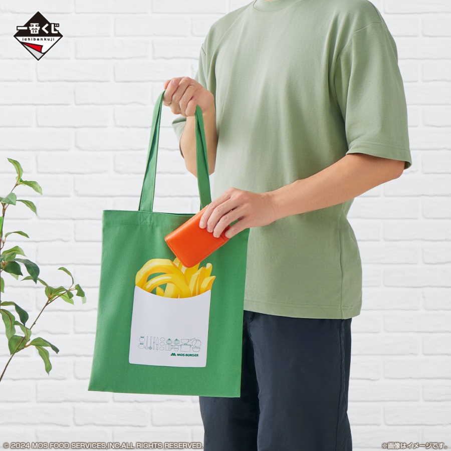 C賞推出的托特包,百搭又耐看!使用日本摩斯漢堡的品牌代表色「綠色」為基調,在包包中央還能撇見超好吃的摩斯薯條。包裝紙袋的部分更被做成了一個可以放入錢包、票卡夾的大口袋,真的好加分!