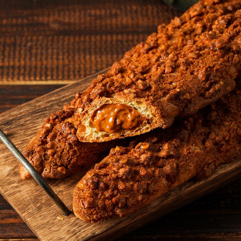 獨家配方製成酥鬆口感的長條型派皮,撒上滿滿香又脆的杏仁角,一口咬下的多層次口感,搭配9月份限定泰式奶茶卡士達口味,都能與杏仁棒棒的香氣完美搭配!