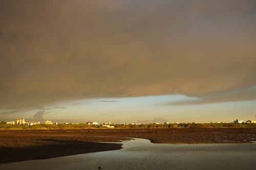 遠方的日落西下後,藍色的天空也漸漸被染成鵝黃色,交織出一片又一片美麗的雲彩。