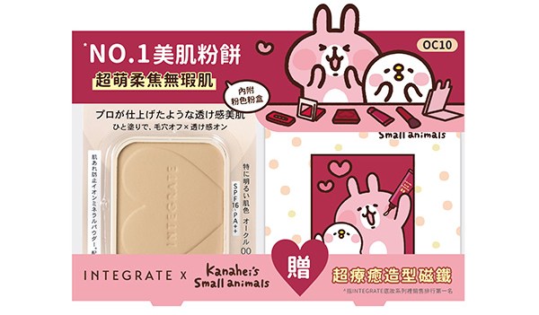以細膩粉質、輕薄妝感受到小資妞妞們喜愛的INTEGRATE柔焦輕透美肌粉餅n,添加高遮瑕力的「潤色粉末」,柔焦修飾肌膚且同時兼具透明感,今年特別與日本的超人氣可愛插畫「