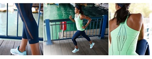 因應跑步需要的支撐與包覆性,在服裝部分的選擇具有中高衝擊度的NB DRY細肩帶運動BRA,其一體成型罩杯與高透氣網布提供運動時的透氣舒適與包覆支撐;NB DRY貼合七分緊身褲以貼合拼接材質減輕重量、同時增加彈性舒適;極致貼合的包覆性可減少肌肉的晃動,易流汗的膝後拼接透氣網布增加透氣度,反光貼條設計則讓光線不足的夜間也能安心訓練。而針對春夏路跑設計的Zante Breathe避震跑鞋,採用高透氣型大網孔,增加熱氣對流,能保持足部乾爽透氣,並搭配貼地式避震中底與單片式橡膠大底,提供舒適腳感與絕佳耐用性,面對逐漸炎熱的天氣依舊維持涼爽舒適。