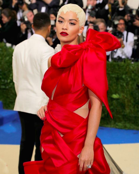 英國性感女歌手Rita Ora這套紅色緞帶長禮服,實在是太美惹,整個人就像是綁上了蝴蝶結的禮物一樣,有點性感又有點甜~臉上的妝容也沒在搞怪,招牌的飽和鮮紅色美唇,搭配輕輕刷上的紅與紫雙色眼影,整個人變得好有氣質。