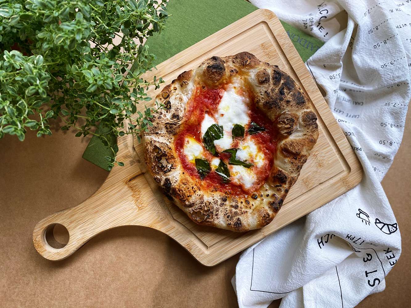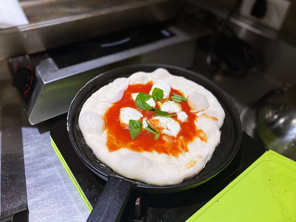 經典瑪格麗特披薩其實在家就能做,利用「鑄鐵鍋」就行!將發酵後的麵糰撒上麵粉避免黏手,接著輕且快速地用手將麵糰從中心往外壓成圓形,然後將番茄醬勺至麵糰上並畫圓,再放上切好的莫札瑞拉起司與適量羅勒,最後淋上初榨橄欖油。放在鑄鐵平底鍋煎1分鐘後,再放入已預熱230度的烤箱烤5分鐘,最後以噴槍炙燒邊緣至部分餅皮有些許焦化,如此一來就能製出口感與窯烤極為相似的披薩!