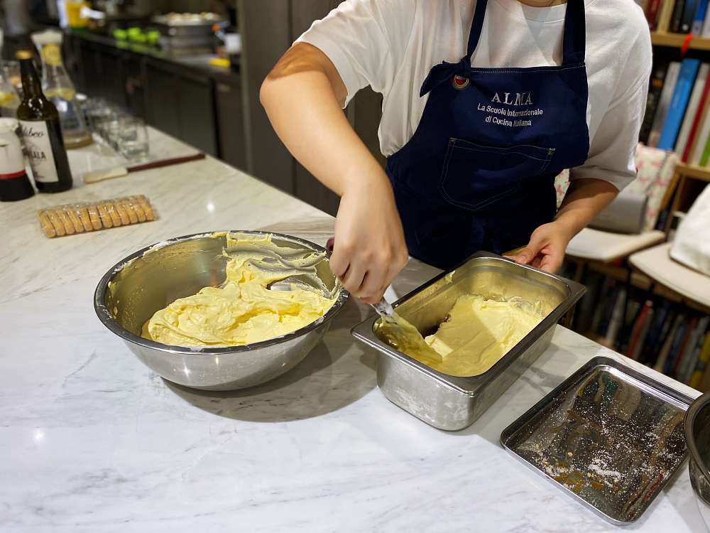 首先將白砂糖加入蛋黃,以打蛋器攪拌至顏色變淡、有鵝黃色感(約90秒);接著用自動攪拌器將蛋白打至軟性發泡(中間加入一小撮鹽並分次添入砂糖,以幫助打發蛋白),然後將蛋黃&瑪斯卡邦乳酪一同拌勻並加入打發的蛋白。手指餅乾兩面輕沾義式濃縮咖啡及馬沙拉酒,鋪在容器後放上混合的材料A,重複兩層後冰3小時以上,盛盤時撒上濃縮咖啡粉即完成。
