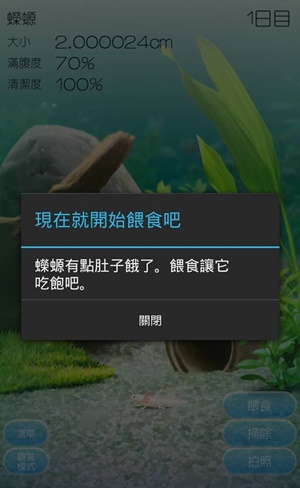 點「餵食」後,飼料就會從天而降,然後你就會看見一隻蠑螈奮力向上爬,還一邊張開嘴巴猛吞飼料。(呆萌呆萌的)